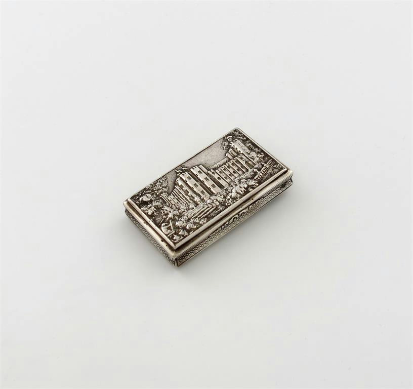 rectangular form, the hinged cover with a relief of Kenilworth Castle from the Elizabethan gardens, the interior cover inscribed 'T. Beaumont Walpole Esq. from John Fisher Esq. of Cossington, Leicestershire, Sept 26th 1849', also engraved with two crests, the base with lattice decoration and initialled, length 6.2cm, approx. weight 1.4oz.