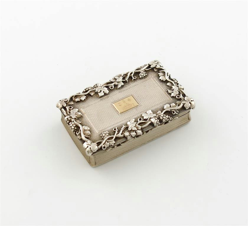 rectangular form, engine-turned decoration, the hinged cover with a cast grapevine border, and with a gold cartouche engraved with a crest, the interior inscribed 'Presented to Thomas Starling Esq. Foreman of the Lent Jury of the Manor of ST. John of Jerusalem for the year 1834, by his brother Jurymen as a token of their esteem and approbation, his impartial conduct while presiding over their labours', length 8cm, approx. weight 4oz.