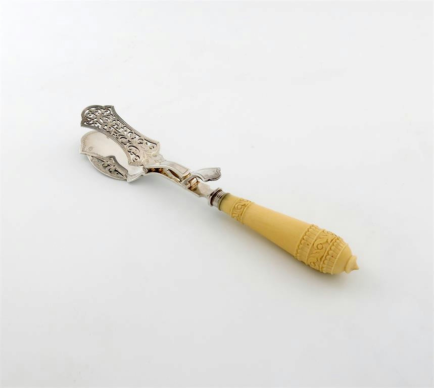 the sprung hinged tongs with pierced and engraved foliate scroll decoration, carved and turned ivory handle, length 29.7cm.
