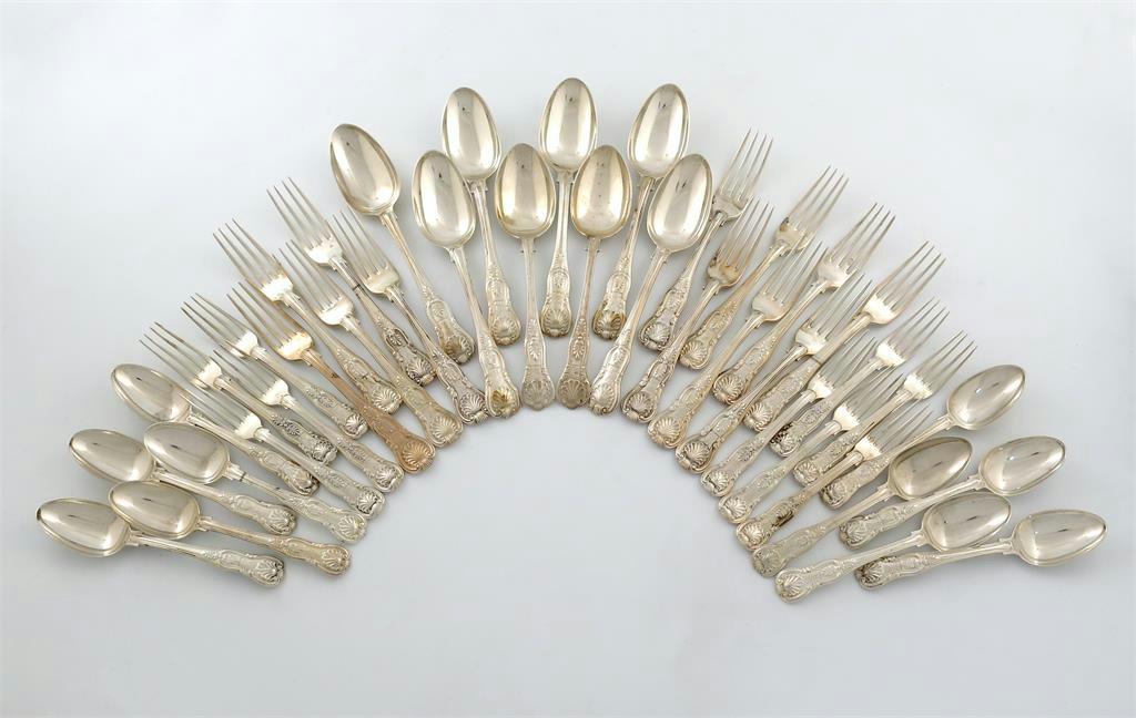 he terminals with a crest, comprising: twelve table forks, ten dessert spoons, six dessert forks, nine dessert forks, and six tablespoons, plus two later tablespoons, Sheffield 1925, approx. weight 100oz. (qty)