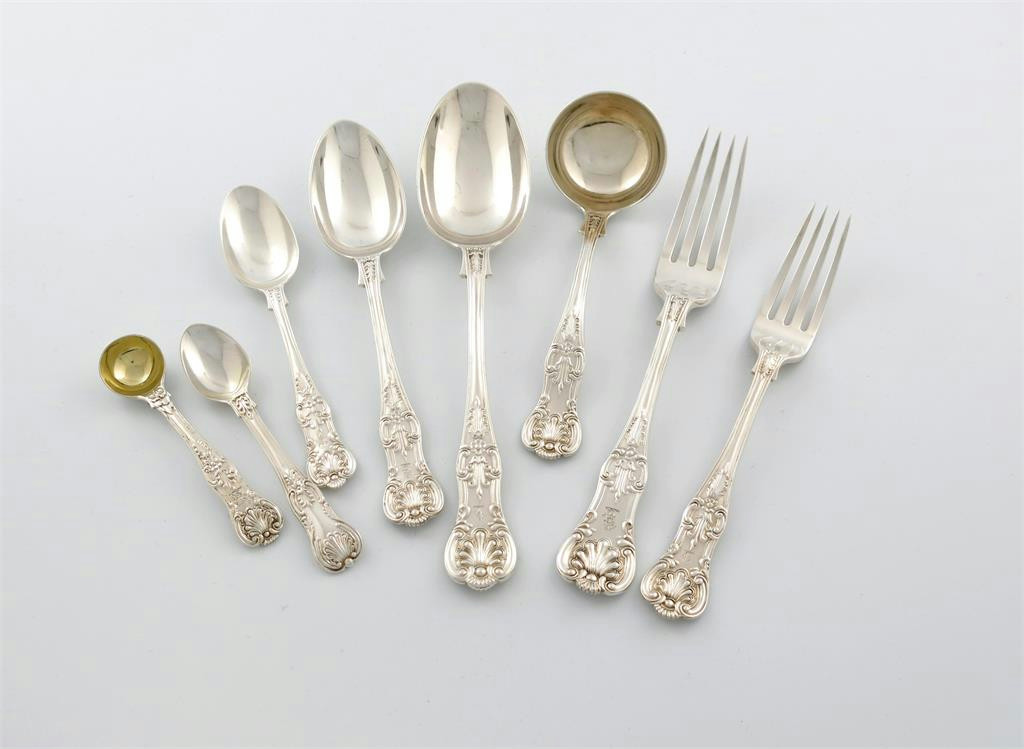 the terminals with a crest, comprising: twelve tablespoons, twelve table forks, twelve dessert forks, twelve dessert spoons, eighteen teaspoons, plus earlier and later matching pieces including: a pair of sauce ladles, by Jackson and Fullerton, London 1906, a pair of salt spoons, London 1828, and four egg spoons, London 1839, approx. weight 164oz. (qty)