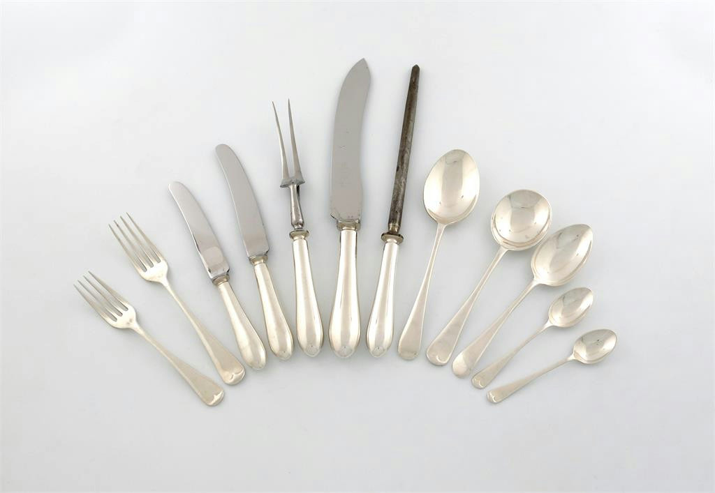 comprising: twelve table forks, twelve dessert forks, six table spoons, twelve soup spoons, eleven dessert spoons (plus one other by W B & Sn Ltd, London 1932), twelve coffee spoons, twelve teaspoons, twelve table knives and twelve dessert knives, with hollow handles and stainless steel blades, a carving knife and fork and sharpener, approx. weighable 140oz. (105)