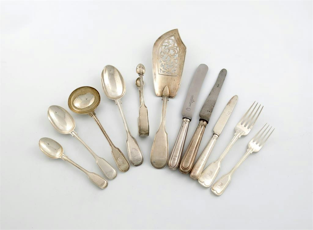 the terminals initialled and crested, comprising: eighteen table forks, six dessert forks, six teaspoons, five dessert spoons, plus four others by another maker, nine tablespoons, (various makers), a pair of sauce ladles, a pair of sugar tongs, and a fish slice, plus eleven Thread table knives and nine dessert knives, approx. weighable 125oz. (qty)