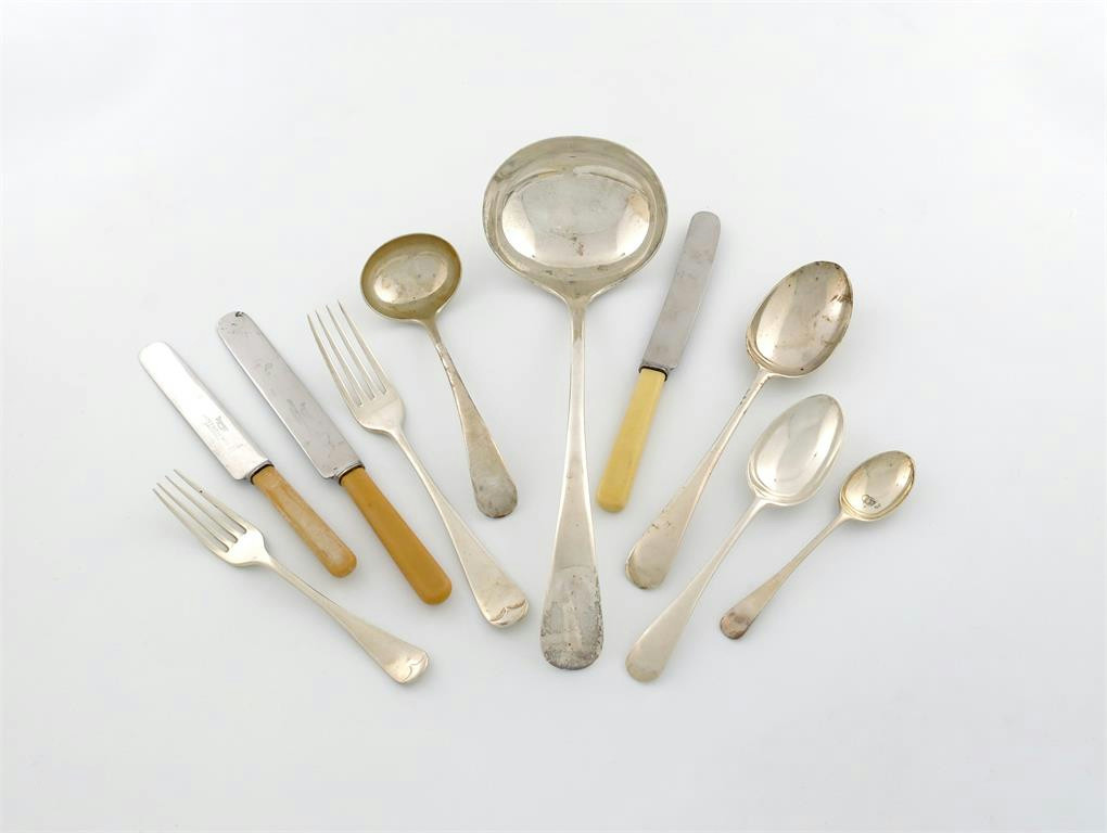 comprising: twenty-four table forks, eleven dessert spoons, (plus one electroplated), ten tablespoons, five teaspoons, plus a soup ladle, and a sauce ladle, by Walker and Hall, plus various table knives and dessert knives, in a fitted wooden case, approx. weighable 132oz. (qty)