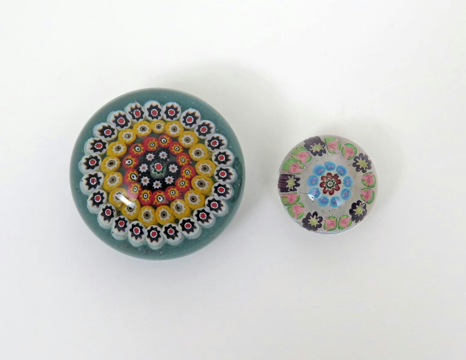 A miniature Clichy millefiori paperweight mid 19th century, set with concentric circles of flowers including the Clichy rose, and a later millefiori paperweight set with five concentric rings on a green ground, 7.2cm dia. max. (2)