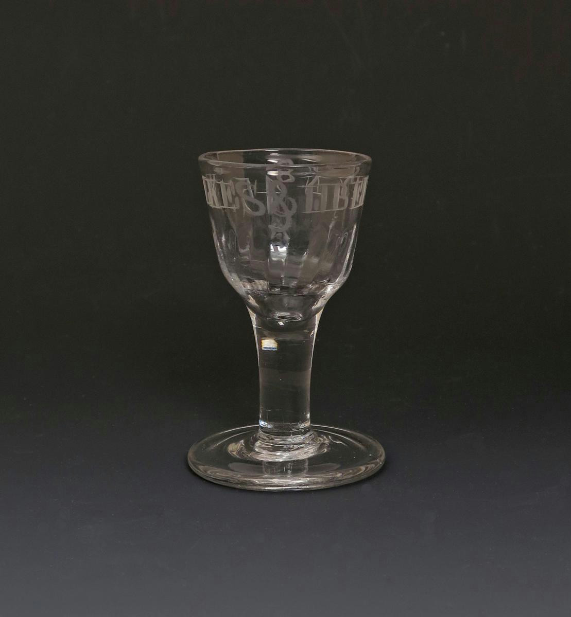 A good and rare political firing glass c.1768, the flared wrythen bowl engraved 'Wilkes & Liberty No.45', raised on a thick plain stem, 10cm.