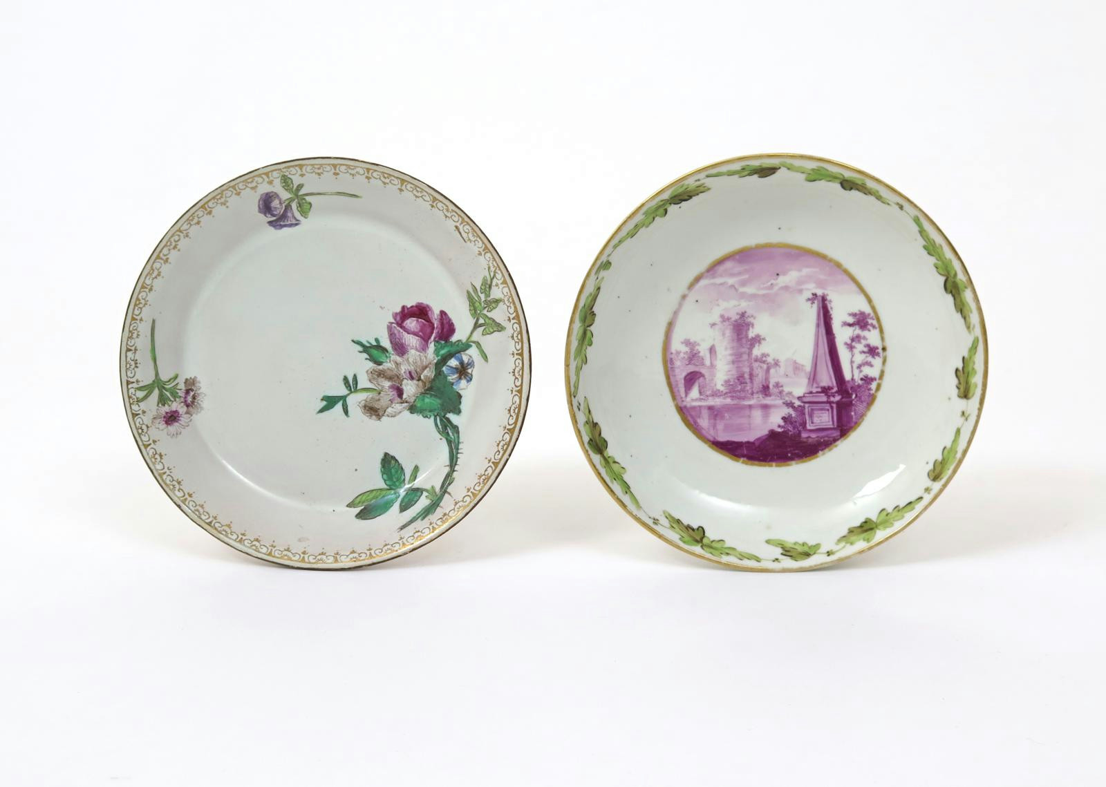 A Kloster Veilsdorf saucer c.1765, the well painted in purpurmalerei with an obelisk at the water's edge, within a leafy border, together with a Marseilles faïence saucer painted with flower sprays within a gilt border, 13.3cm max. (2)