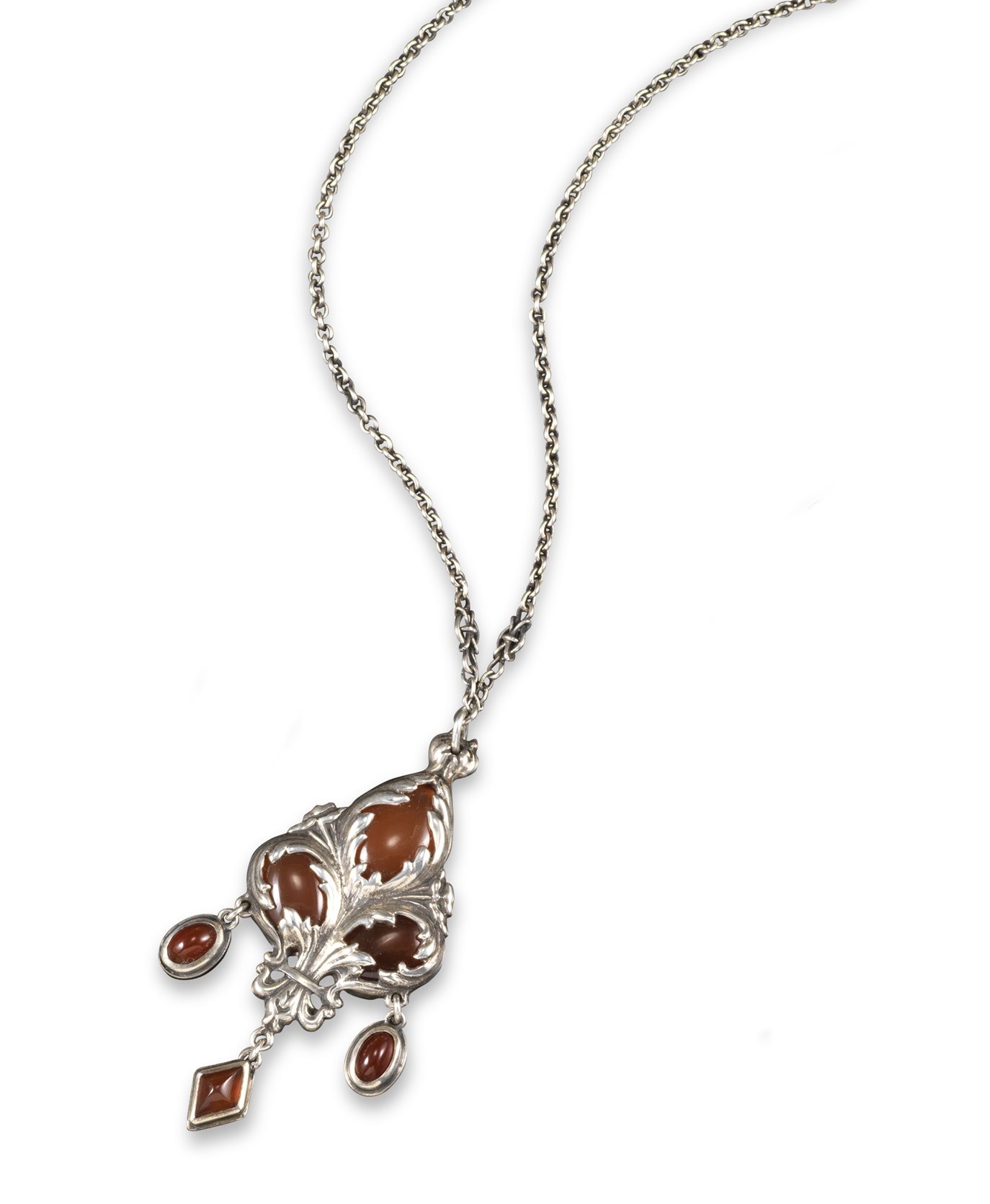 An Arts and Crafts carnelian mounted silver foliate pendant, probably by Omar Ramsden. With three larger oval-shaped carnelians and supporting three smaller carnelian pendants, on a long silver neck chain with S-form clasp. The pendant 7.5cm high, the chain 76cm long. Fitted case. The silk signed Omar Ramsden, Artist, Goldsmith, London, England.