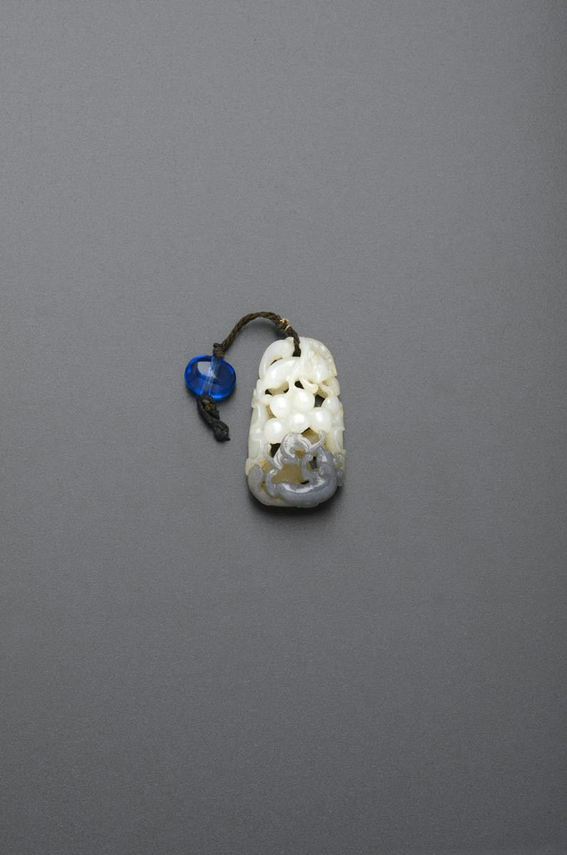 A CHINESE WHITE AND GREY JADE PENDANT QING DYNASTY Delicately carved with a fruiting grape vine