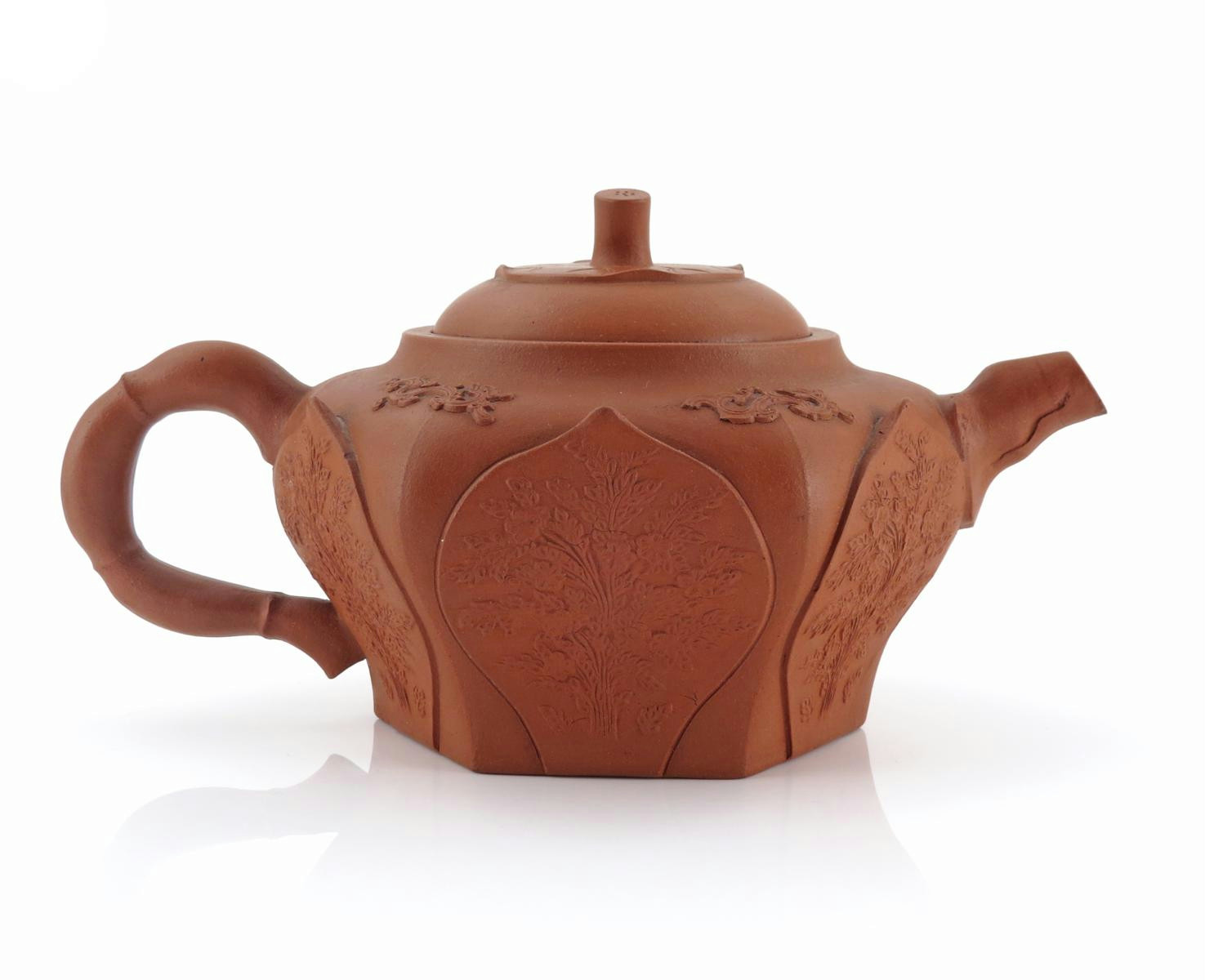 A CHINESE YIXING LOTUS TEAPOT AND COVER 18TH/19TH CENTURY With six petal-shaped panels rising...