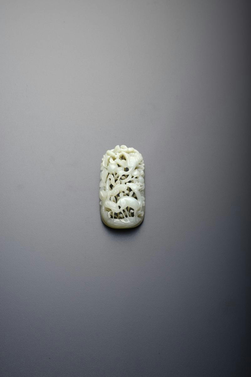 Finely carved in high relief with a deer and a crane amongst extensive fruiting peach foliage, a lingzhi fungus between them, another crane in flight above, 7.8cm.