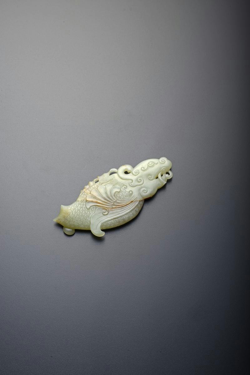 A CHINESE CELADON JADE CARVING OF A DRAGON FISH