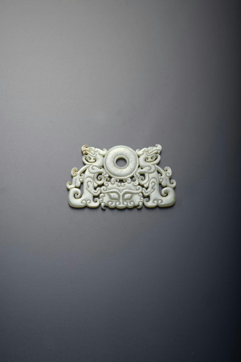Carved as a bi disc, decorated with C-scrolls and surmounting a taotie mask, a stylized dragon standing to either side, 10.3cm.