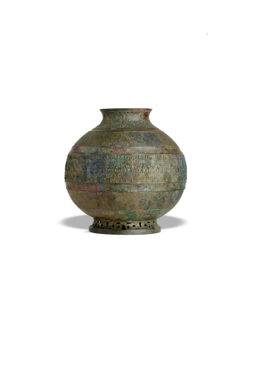 The spherical body supported on a splayed reticulated foot, cast with a band of S-shaped dragons, the body with four bands of interlocking stylized dragons, reserved on a leiwen ground, the base with lug locks, the surface with a mottled green, blue and iron-red patina, 25.7cm.