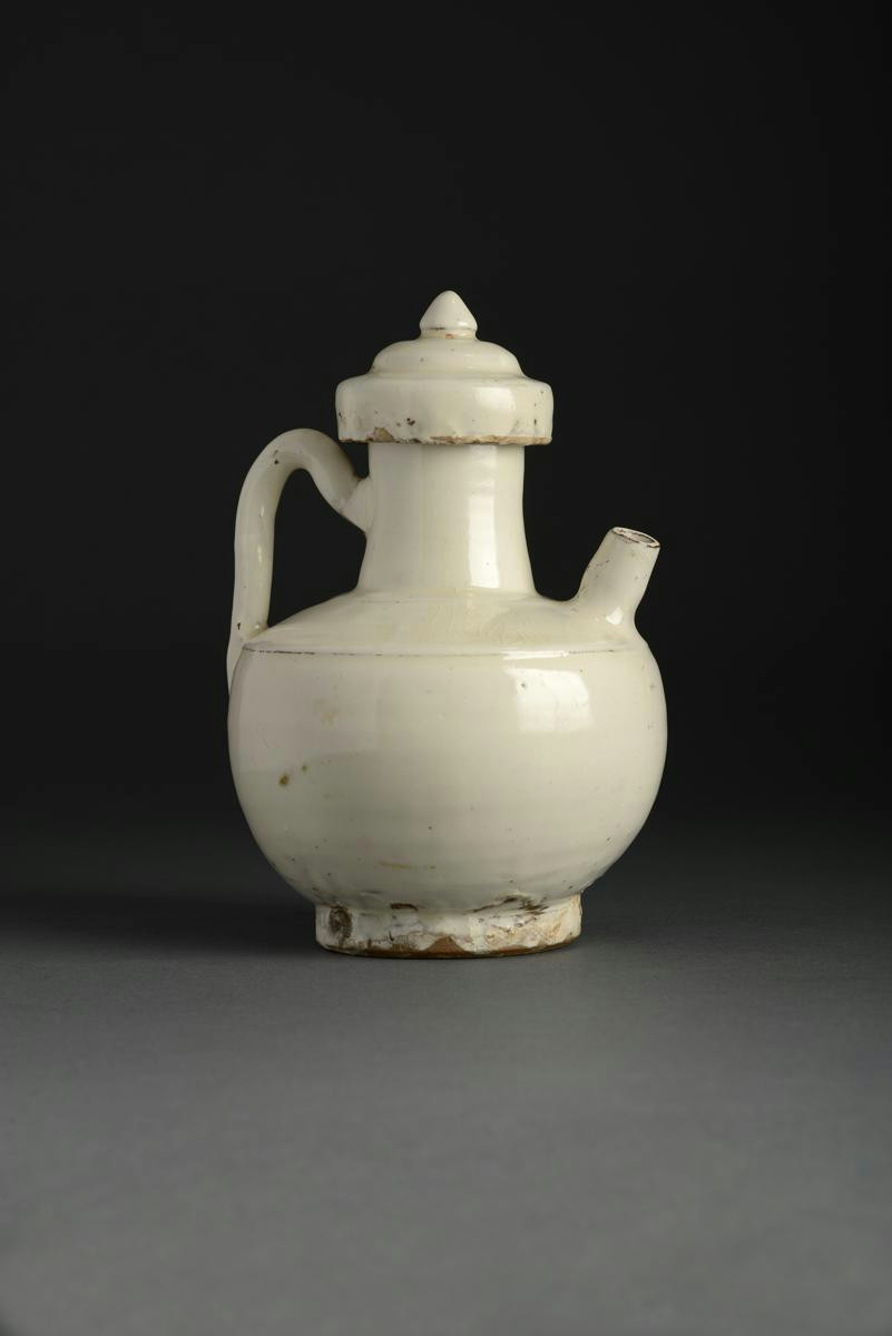 The ovoid body rising to a cylindrical neck, and with a short spout to the shoulder, decorated all over with a rich creamy glaze, a paper label for Blitz Oriental Art Amsterdam, 17.3cm. (2)