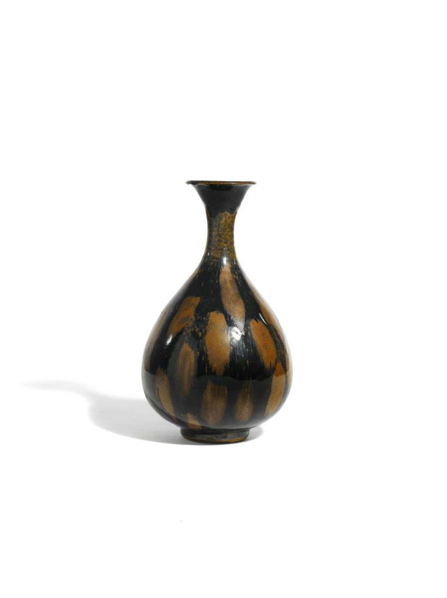 The bulbous pear-shaped body raised on a short foot, the neck rising to a widely flaring rim, decorated in an unctuous black glaze draining from the rim and with elongated brown splashes to the body, 27cm.
