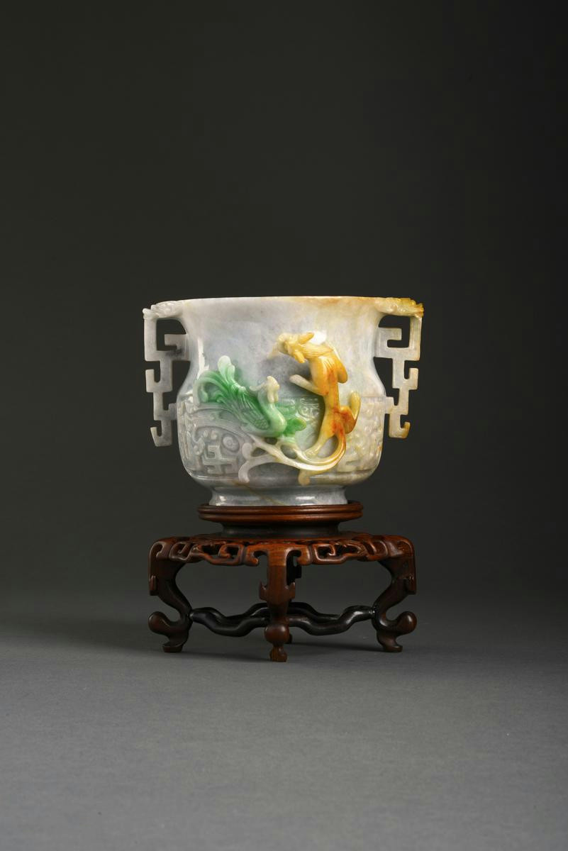 Carved to the exterior with a phoenix and a chilong, and with a band of taotie masks beneath them, raised on a four-legged hardwood stand, 15.2cm. (2)