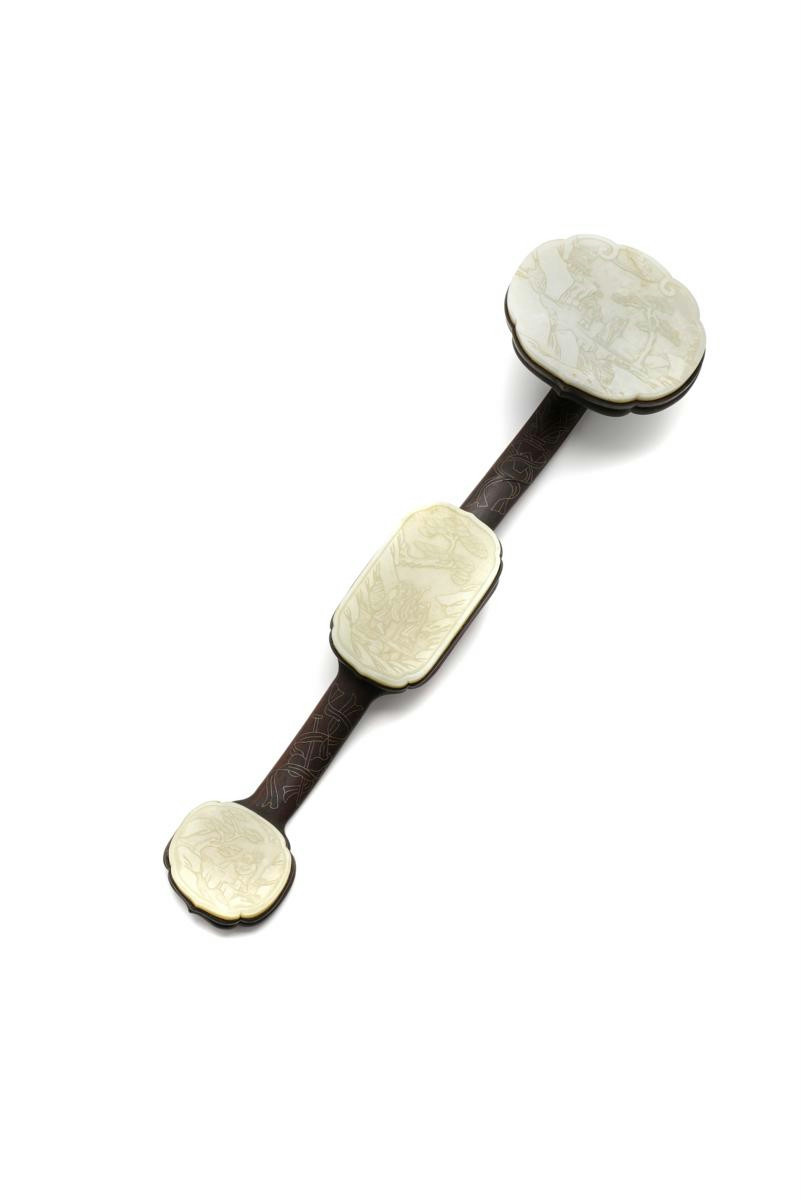 A CHINESE JADE-MOUNTED WOOD RUYI SCEPTRE LATE QING DYNASTY Mounted with three plaques