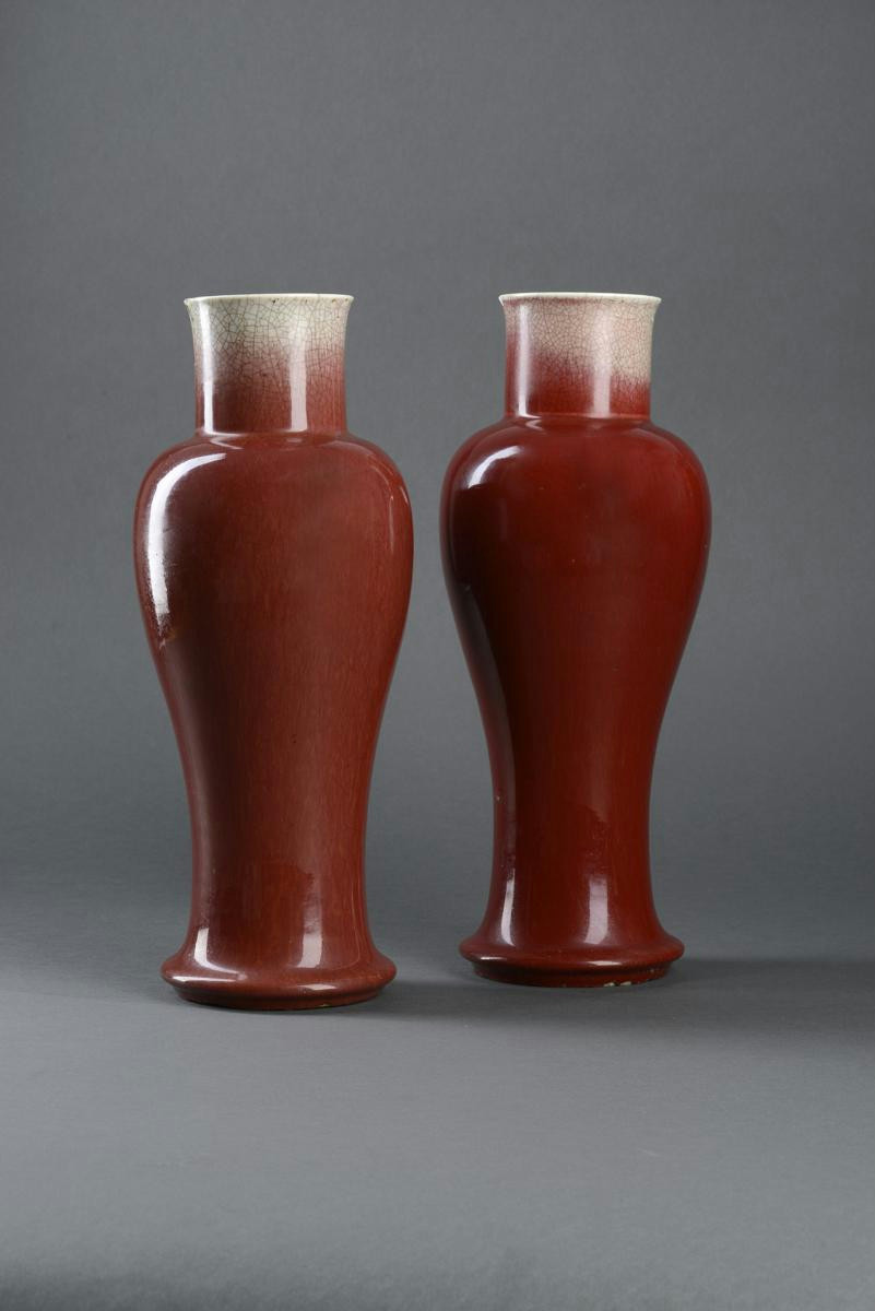 Each tapering body with a cylindrical neck, decorated with a red glaze draining from the rim, 41cm. (2)