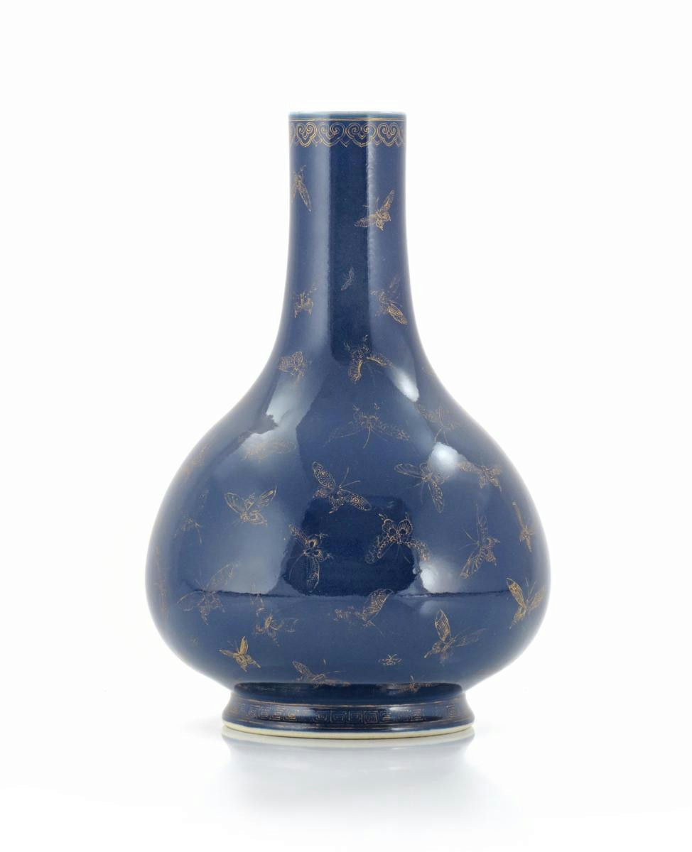 A CHINESE BLUE GROUND BOTTLE VASE 19TH CENTURY Decorated with gilt butterflies beneath a border...