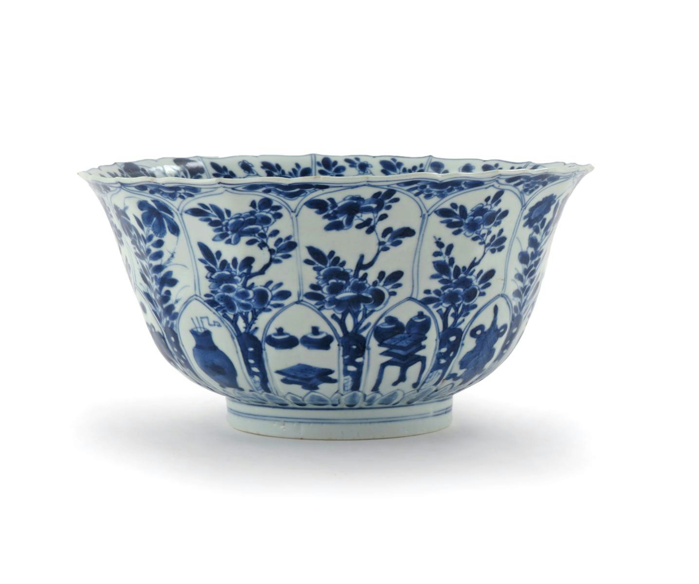 A CHINESE BLUE AND WHITE MOULDED BOWL KANGXI 1662-1722 The flared body with a scalloped rim