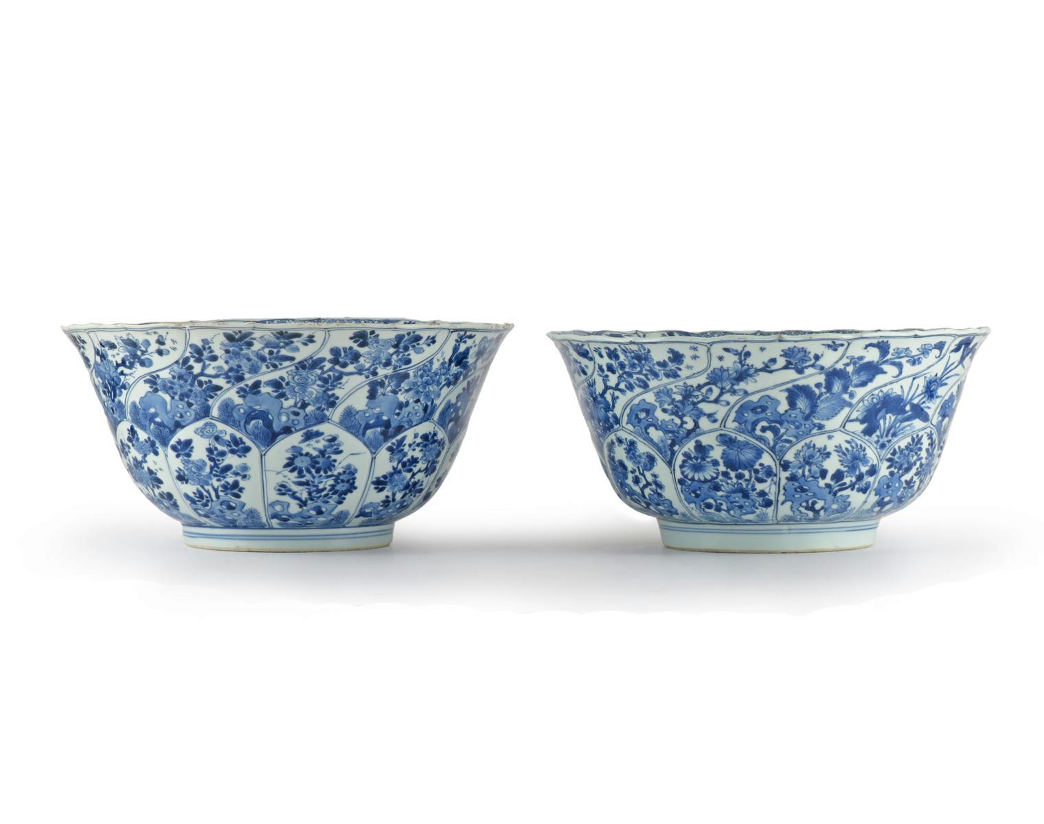 A PAIR OF LARGE CHINESE BLUE AND WHITE BOWLS KANGXI 1662-1722 Each moulded with petal-shaped...