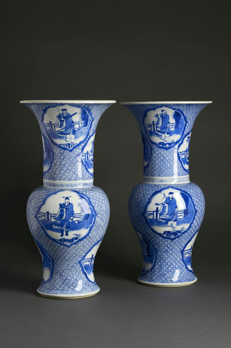 A PAIR OF CHINESE BLUE AND WHITE YEN YEN VASES KANGXI 1662-1722 Painted with shaped panels...