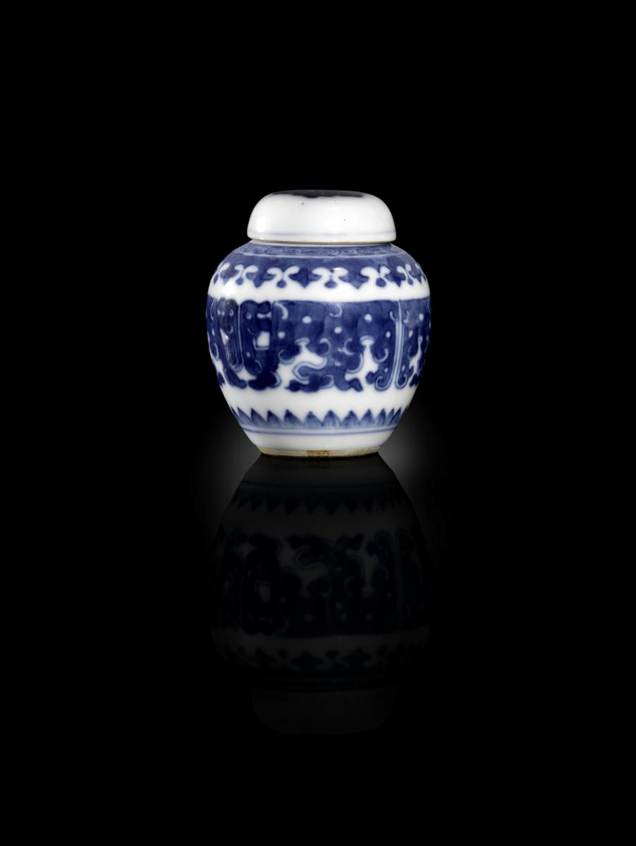 A CHINESE BLUE AND WHITE OVOID JARLET AND COVER QIANLONG 1736-95 Painted with an archaistic...