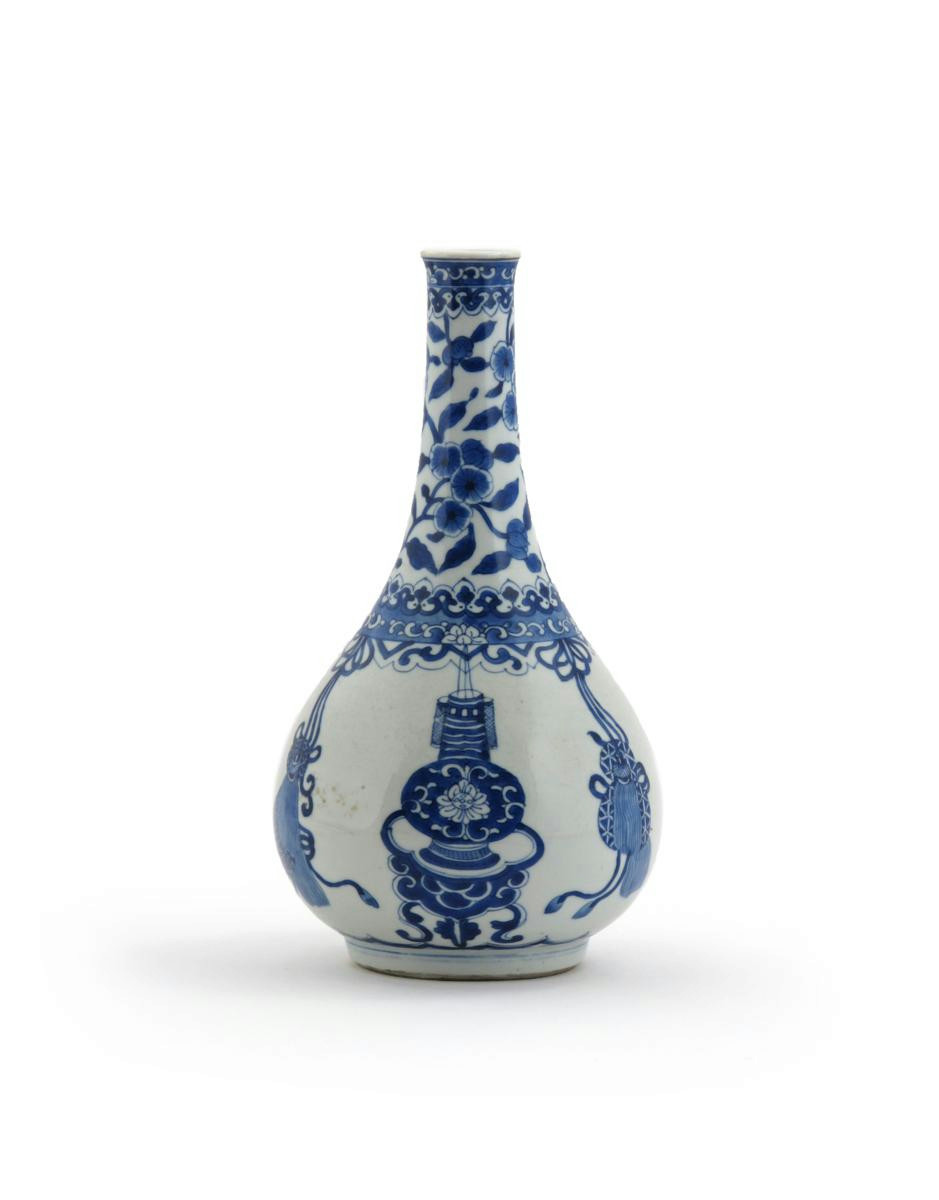 A CHINESE BLUE AND WHITE BOTTLE VASE KANGXI 1662-1722 The globular body painted with vases and...