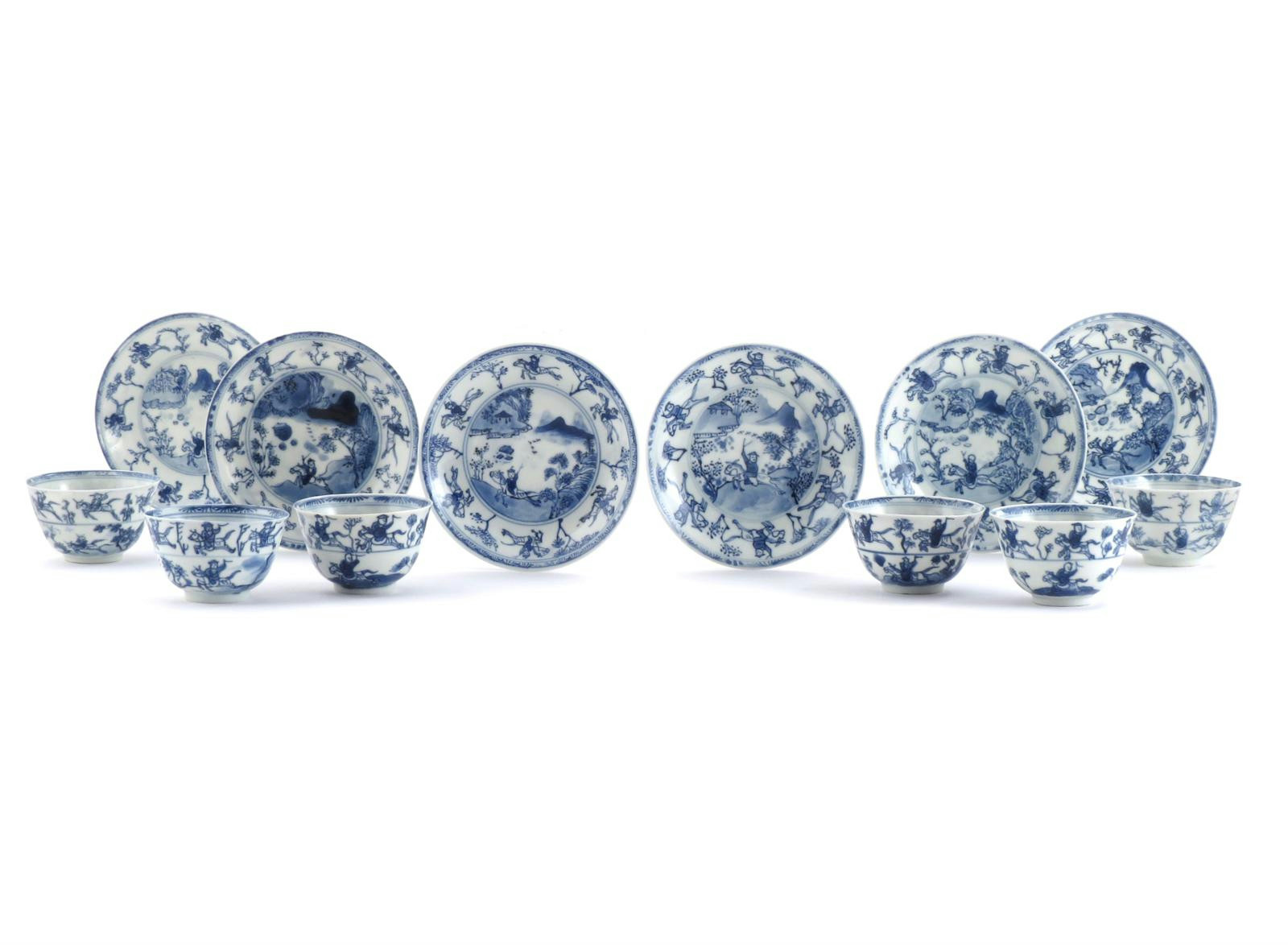 A SET OF SIX CHINESE BLUE AND WHITE TEA BOWLS AND SAUCERS YONGZHENG 1723-35 Painted with...