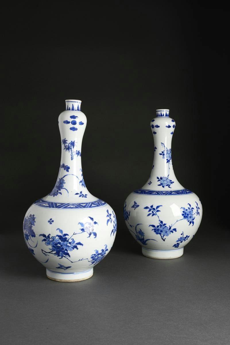 A PAIR OF CHINESE BLUE AND WHITE BOTTLE VASES C.1640 Each ovoid body rising to a garlic-mouthed...