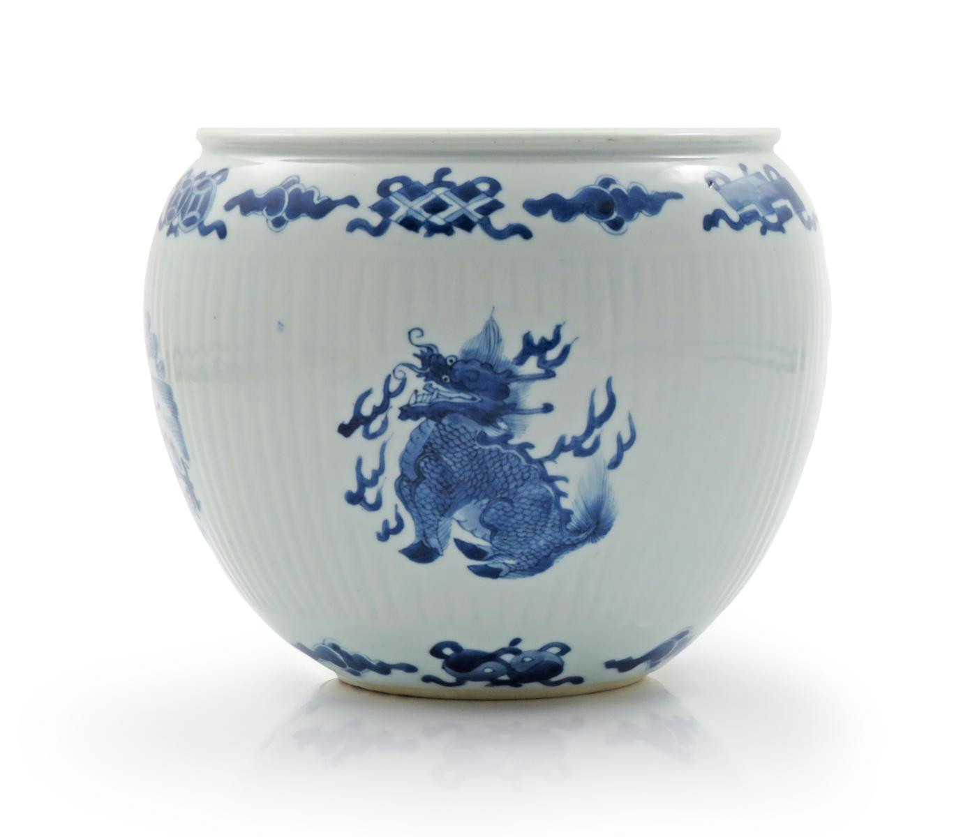 Decorated to the exterior with four roundels, one containing a fish, one a dragon, another a kylin, the fourth an inscription which reads xia yue gong wei qing yun ju ya wan, ou mo, all within bands of clouds and auspicious things, the base with a six character Jiajing mark, 22cm dia.