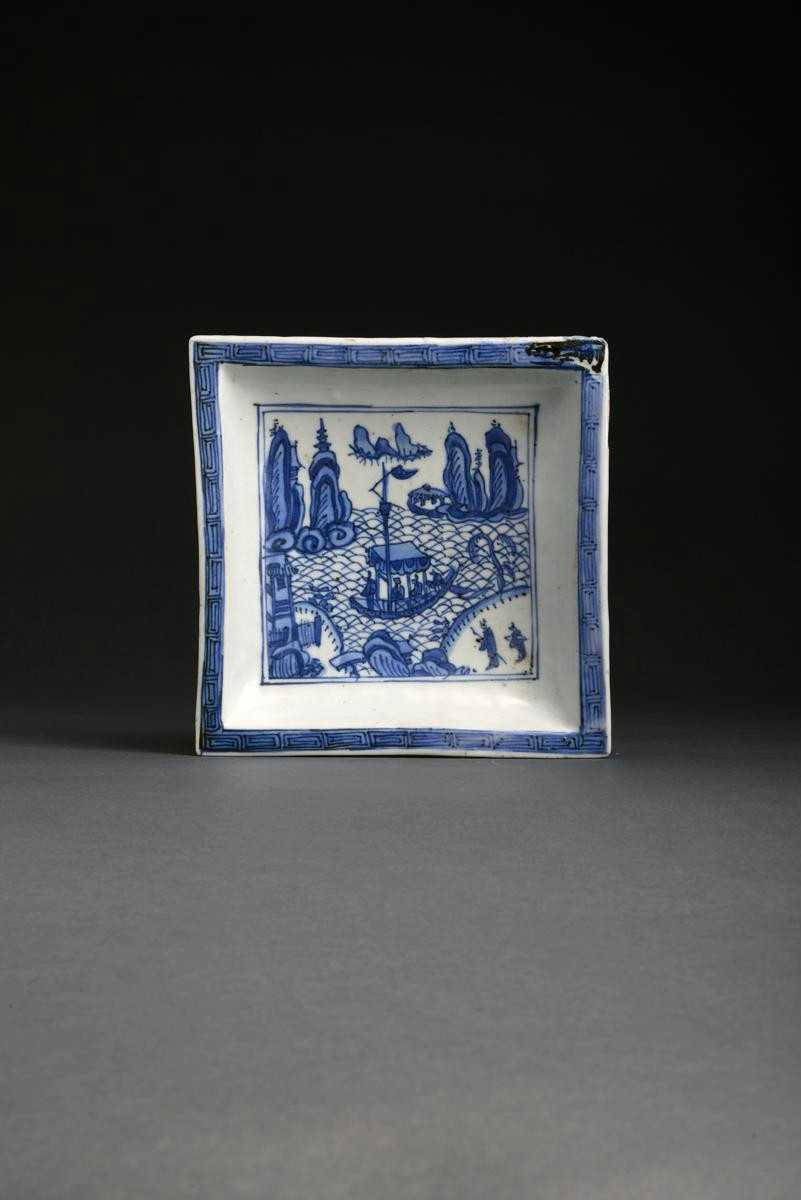 A CHINESE BLUE AND WHITE SQUARE DISH WANLI/TIANQI C.1620 Painted to the well with a mountainous...