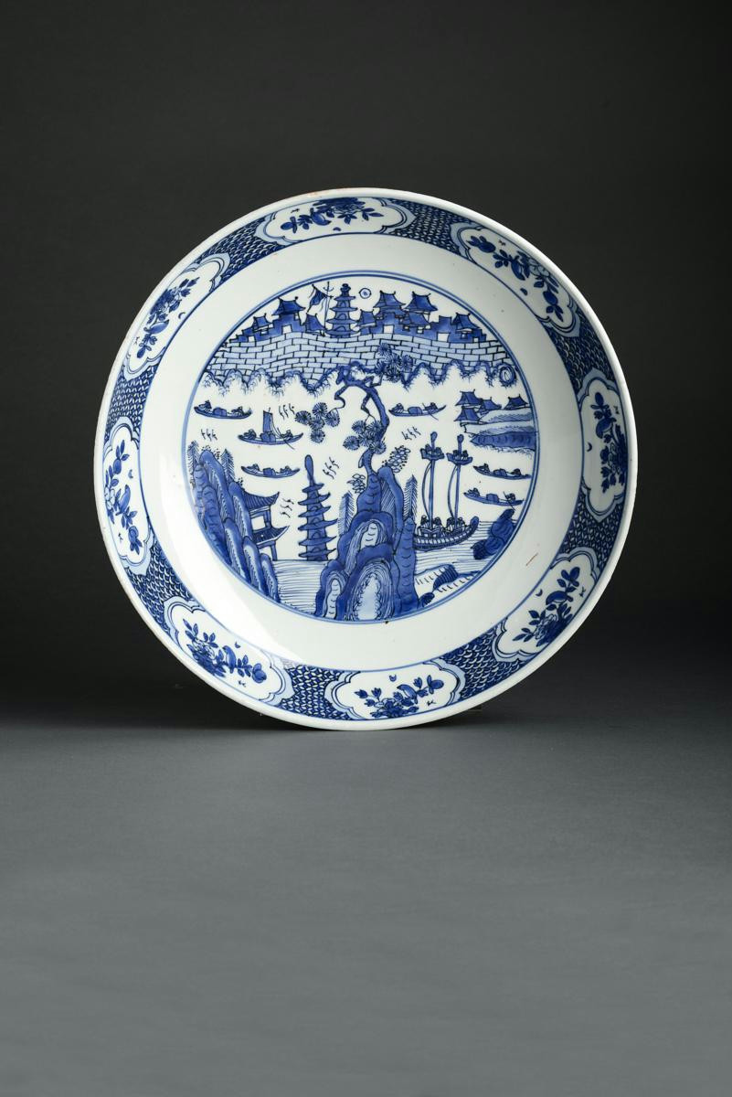 A CHINESE BLUE AND WHITE DISH WANLI 1573-1620 Painted with boats on a river beneath a city wall