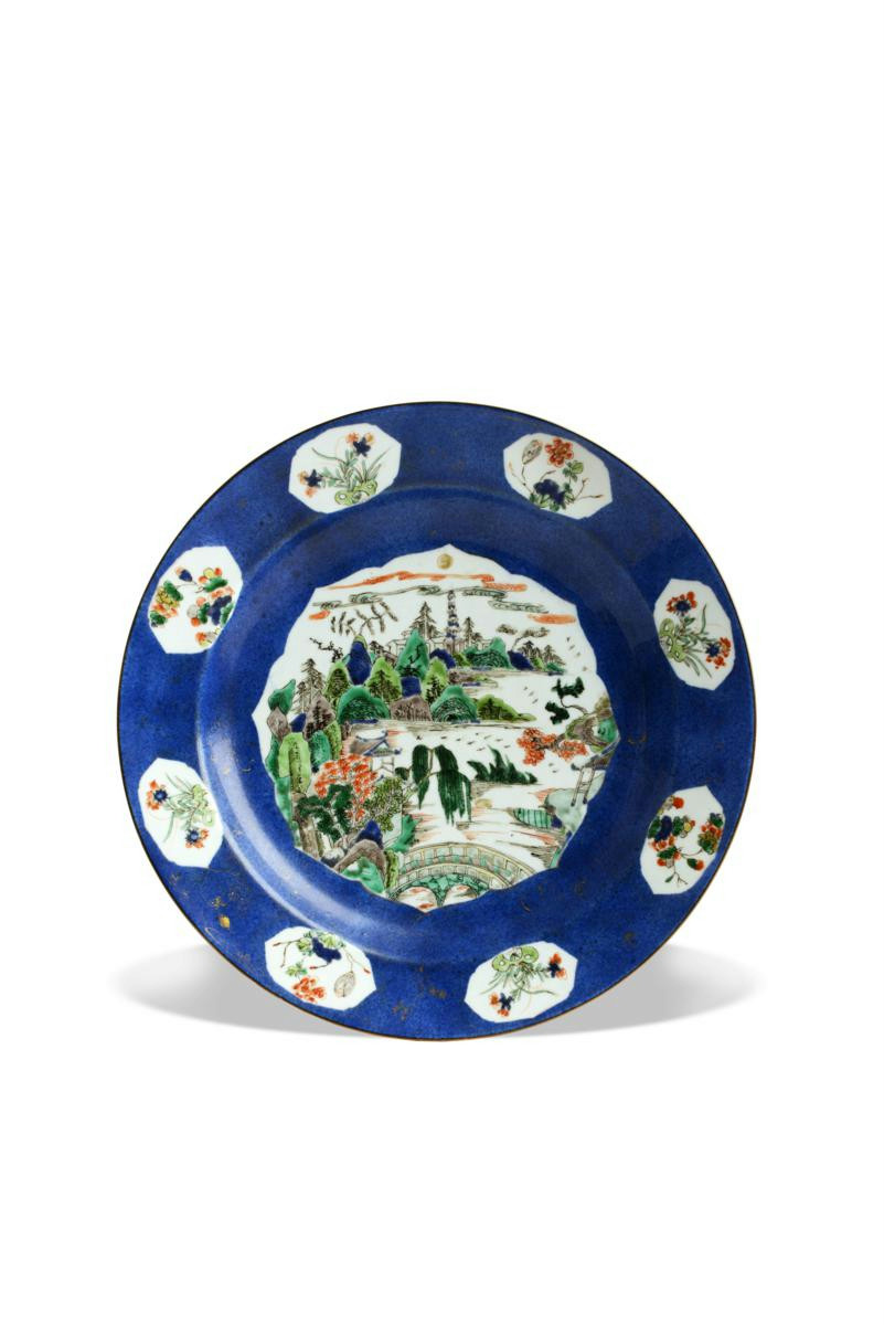 A LARGE CHINESE FAMILLE VERTE BLUE GROUND DISH KANGXI 1662-1722 Painted with a central barbed...