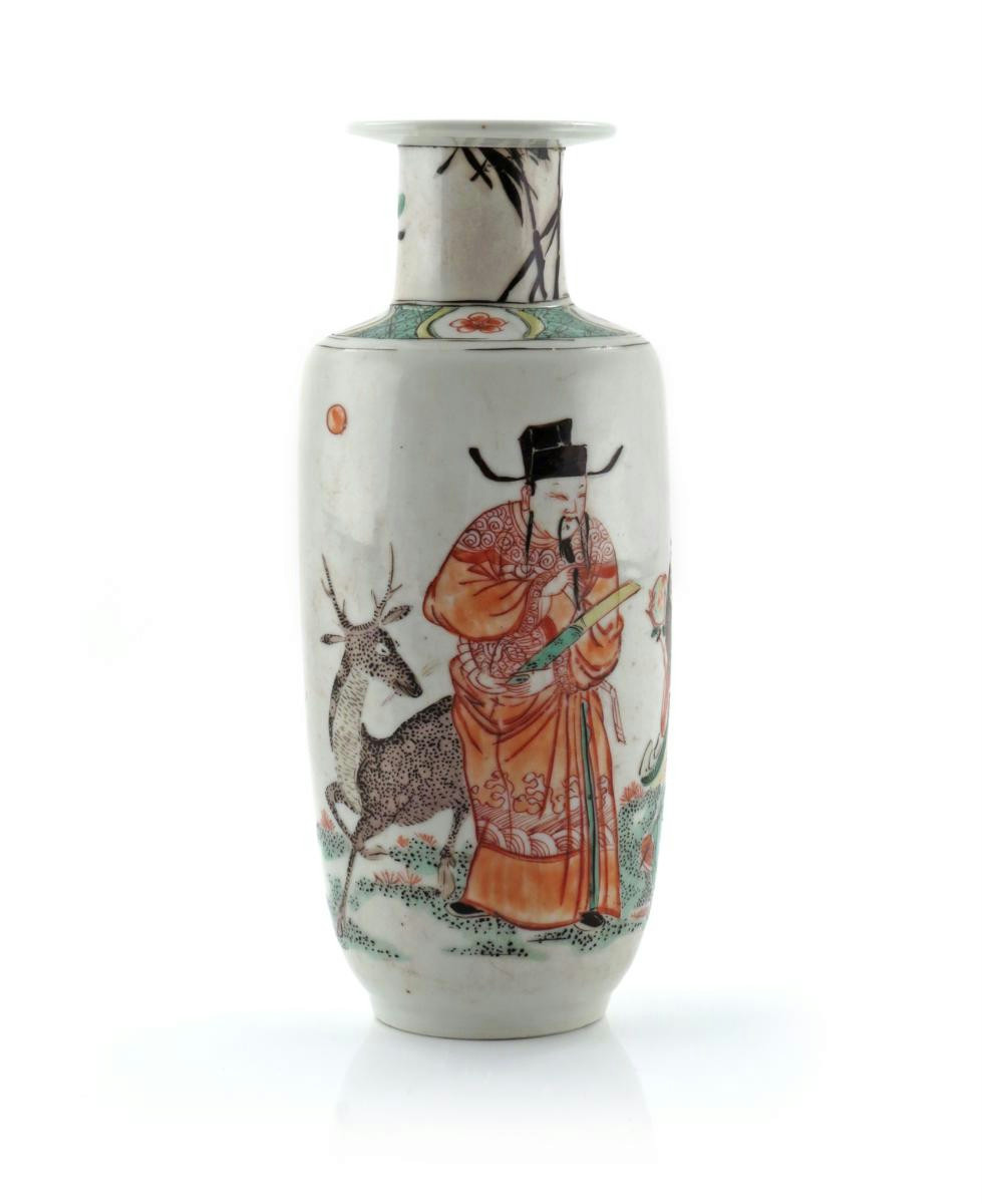 A SMALL CHINESE FAMILLE VERTE ROULEAU VASE KANGXI 1662-1722 Depicting Shoulao and the official...