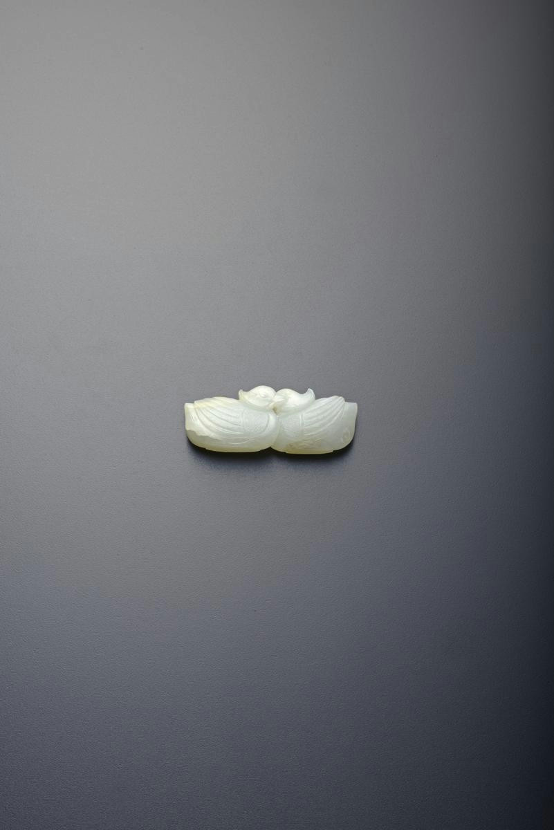A CHINESE PALE CELADON JADE CARVING OF A PAIR OF MANDARIN DUCKS 19TH CENTURY Facing one another...