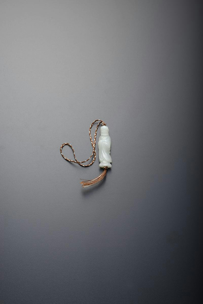 Standing, his long robes held about him, his head slightly down-turned, the carving pierced and suspended from a cord, 5cm.