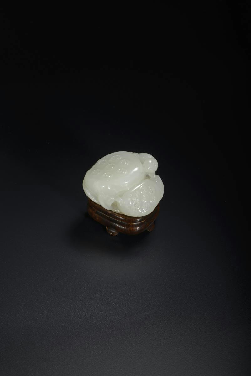 With two large seed pods resting on a single lotus leaf, with tendrils extending outwards, a small bird perched on the curling leaf-edge, raised on a fitted hardwood stand, 5.5cm. (2)