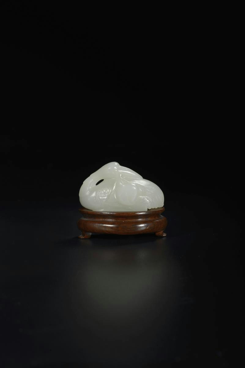 A CHINESE PALE CELADON JADE CARVING OF A CRANE QING DYNASTY Seated with its legs tucked neatly...