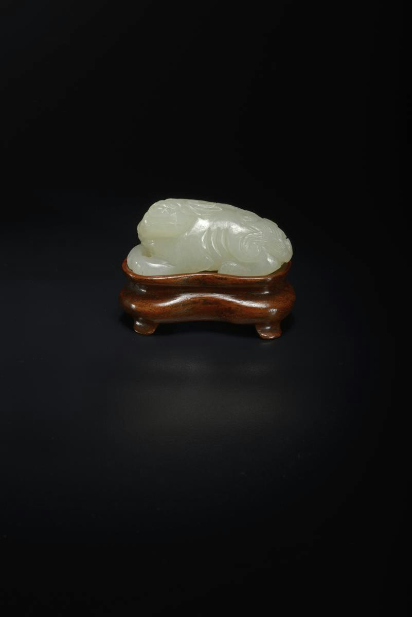In a recumbent position, its forepaws stretched before it, its head raised and ears flattened against its body, together with a fitted hardwood stand, 5cm. (2)