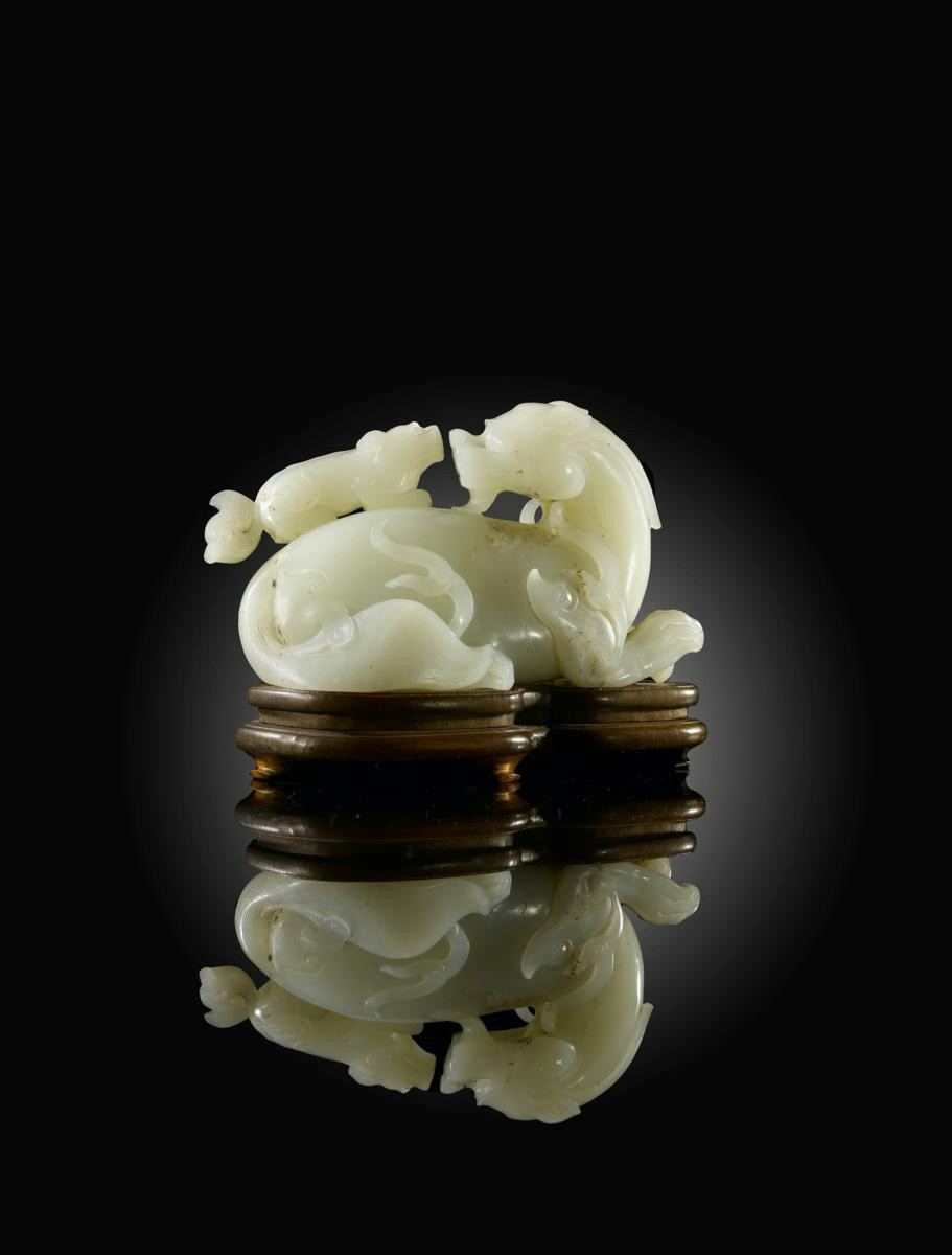 A CHINESE PALE CELADON JADE MODEL OF A KYLIN QIANLONG 1736-95 Crisply carved in a recumbent position