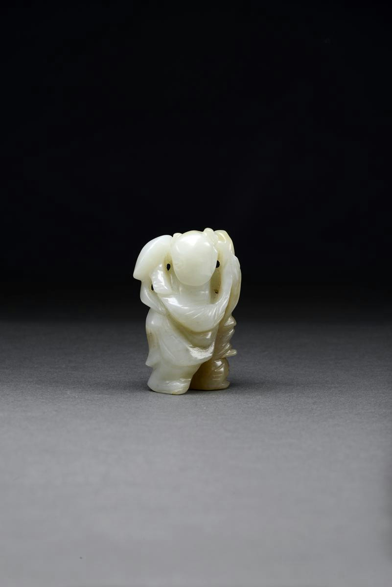 A CHINESE CELADON JADE CARVING OF A BOY MING/QING DYNASTY Standing with his foot raised
