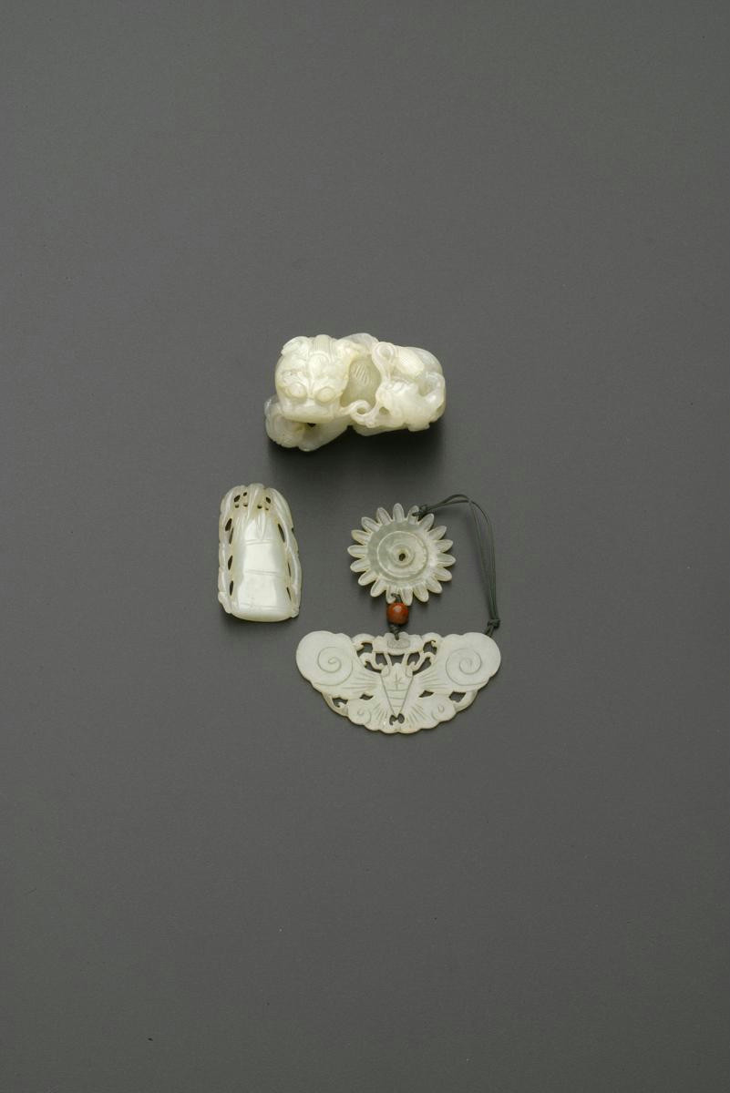 With a ribbon in her jaws and a brocade ball at her feet, a small puppy clambering upon her back, together with two small jade plaques, one carved as bamboo, the other a chrysanthemum flowerhead suspended above a butterfly by a cord, 6cm max. (3)