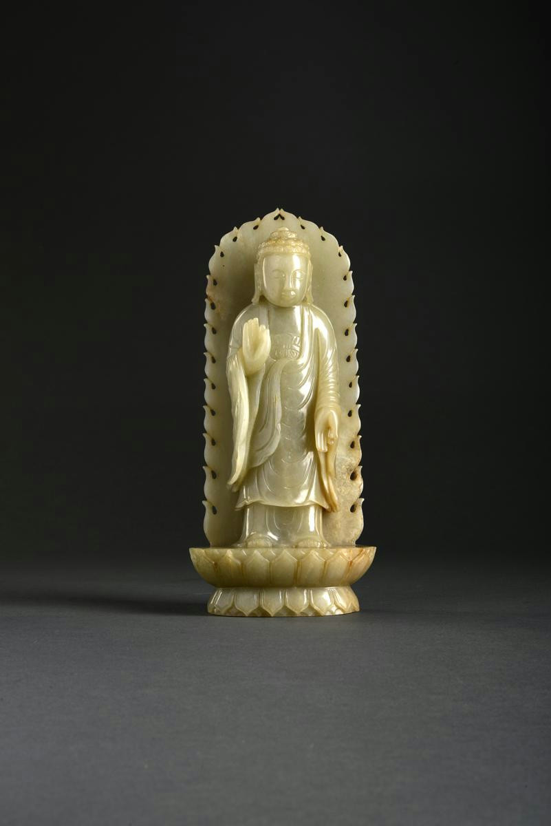 A CHINESE CELADON JADE CARVING OF SAKYAMUNI BUDDHA 18TH/19TH CENTURY Standing on a double lotus...