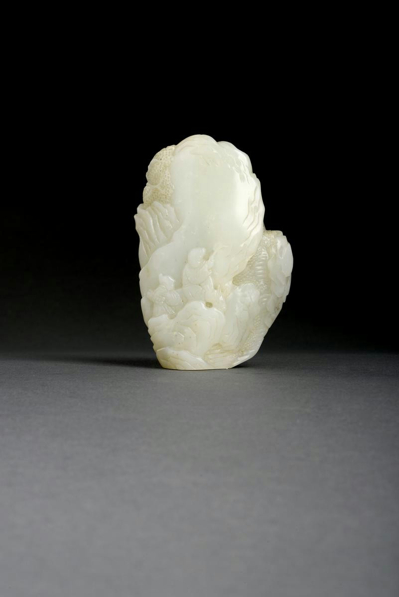 A CHINESE PALE CELADON JADE SMALL BOULDER CARVING QING DYNASTY Depicting two figures