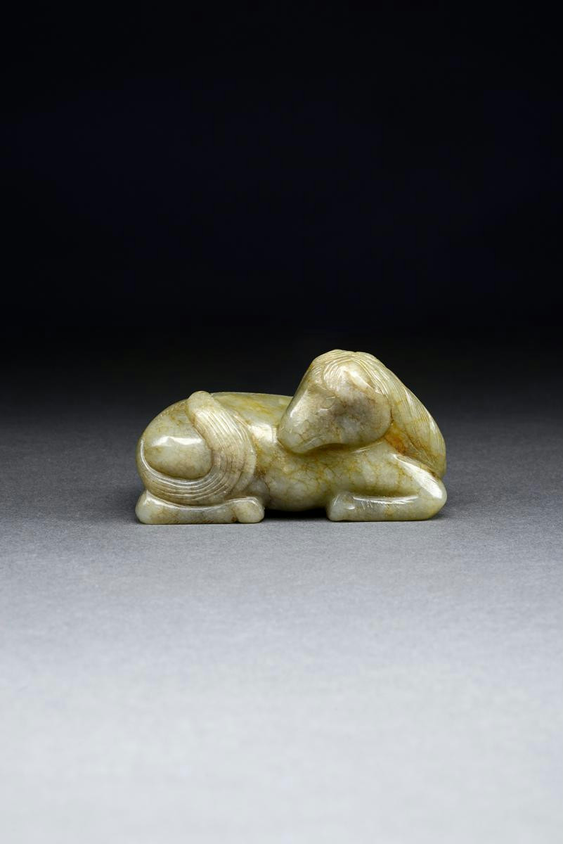 A CHINESE CELADON JADE MODEL OF A RECUMBENT HORSE