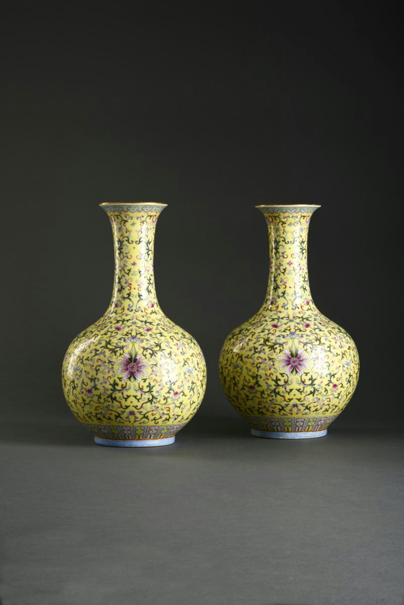 A PAIR OF CHINESE FAMILLE ROSE BOTTLE VASES 19TH CENTURY Each decorated with a stylized lotus scroll
