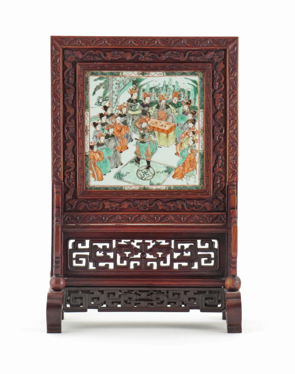 Painted to one side with two deer beneath pine, to the other with a group of figures, mounted in a later hardwood table screen, carved with borders of flowers and bats, stylized dragons and key fret, 46cm x 30cm. (2)