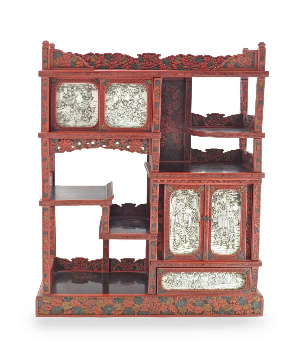λ A JAPANESE RED LACQUER AND IVORY SHODHANA MEIJI 1868-1912 With asymmetric shelves